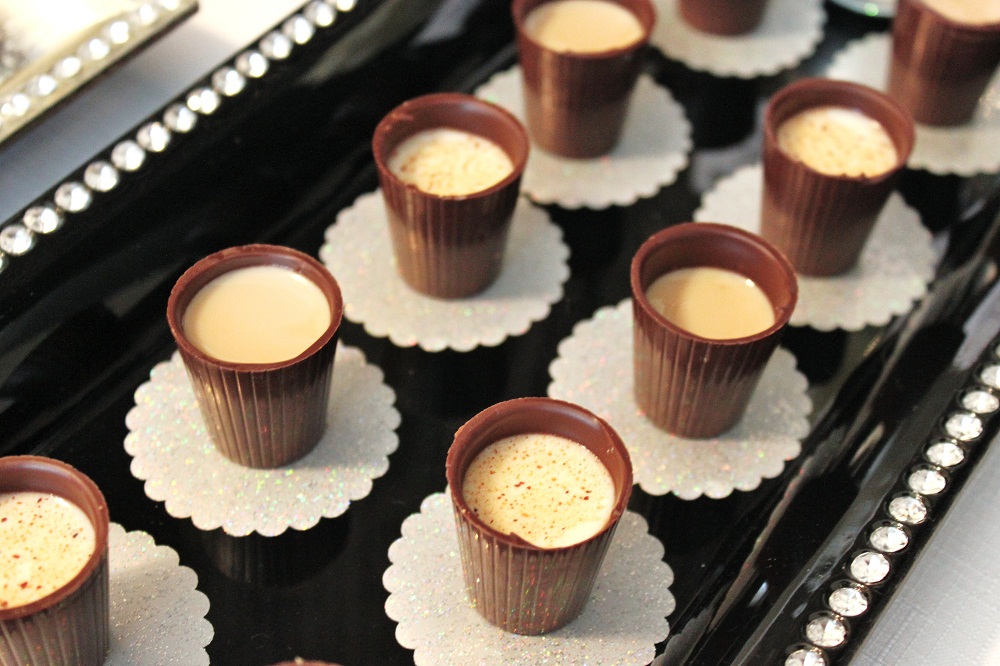 The edge of each glass is rimmed with edible glitter by Sweet! Baking Supply,