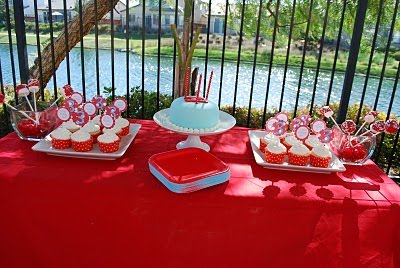 “We celebrated our sweet son Jake’s third birthday with a backyard sail boat party! It was a beautiful, relaxing day full of fun friends {and little swimming pools, a water table, squirt guns and water balloons}. I bought the Sail Away pdf file from paperandcake.com and loved it! For favors, we had a red, white and blue candy bar for all of the guests, along with books for each friend {from the $1 section at Target!} We love you, our silly sweet Jakers!” – Laurie