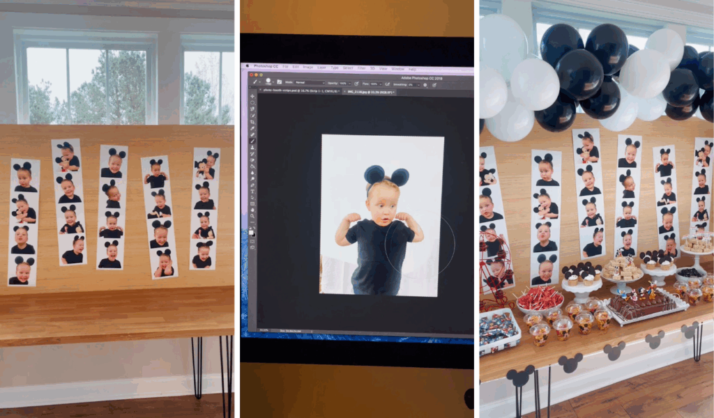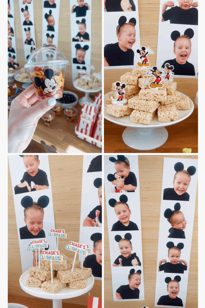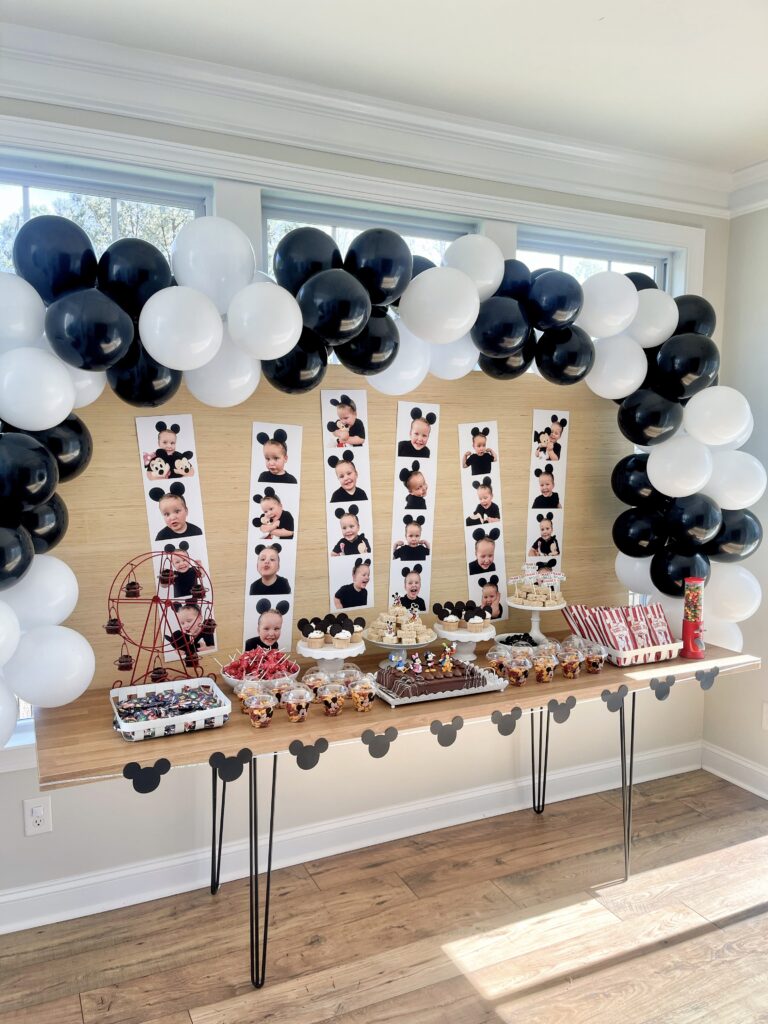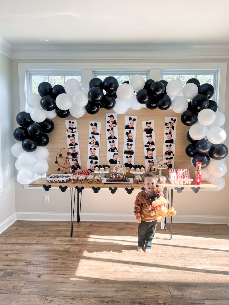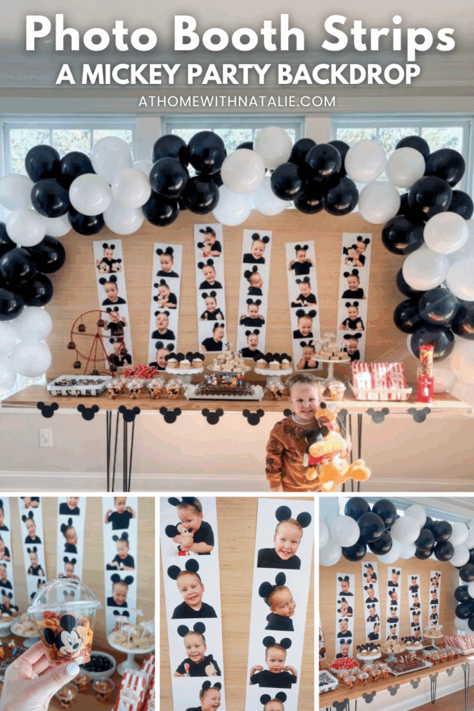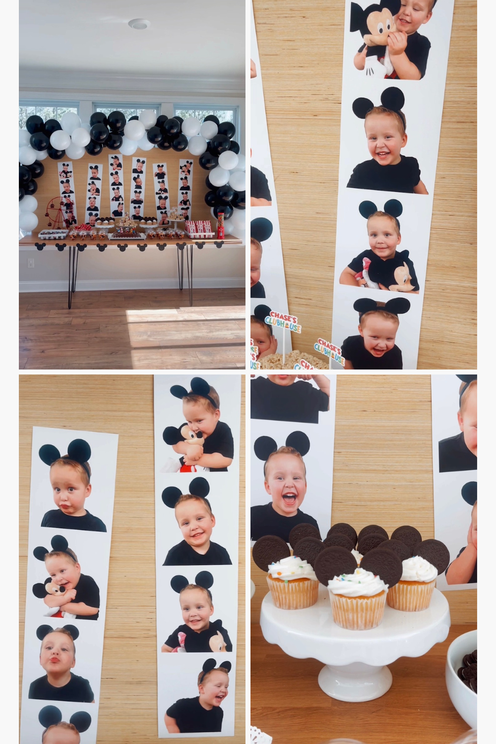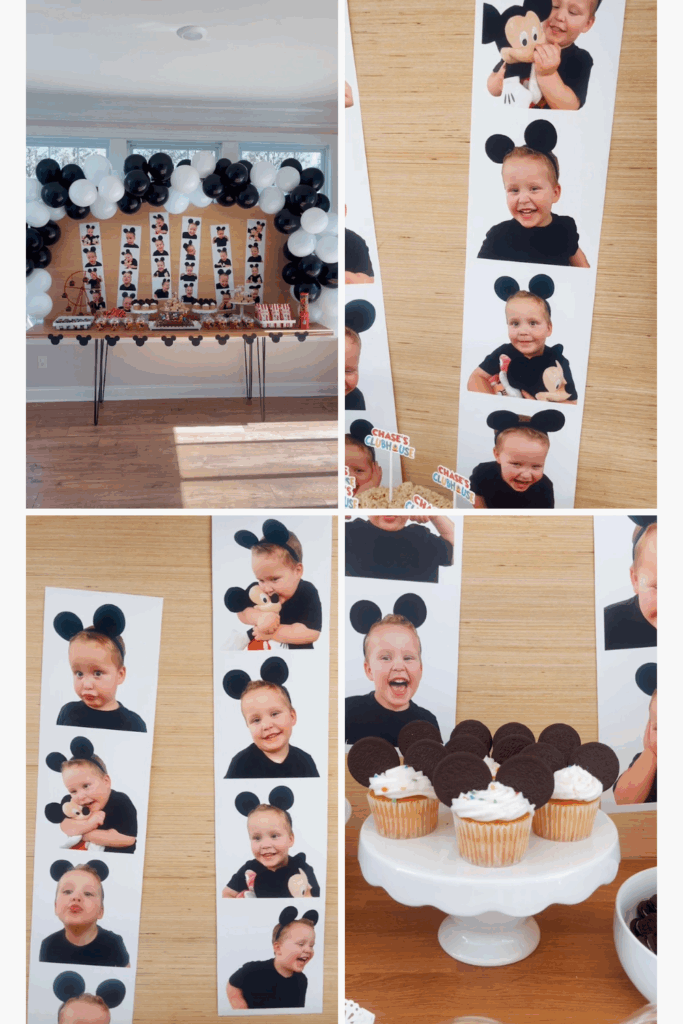 The backdrop looked so good in all the party photos! I love how such a simple DIY project made a huge impact on the vibe of the party! The black and white themed mickey party was made even cuter with these photo strips of Chase!