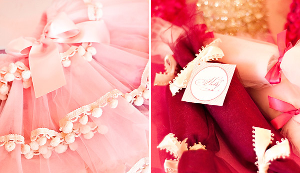 each guest was also given a large box, wrapped in pink and tied with a cranberry satin ribbon and with a pretty custom printed gift tag. In it she put sweet, simple, and fluffy no-sew tutus she made!